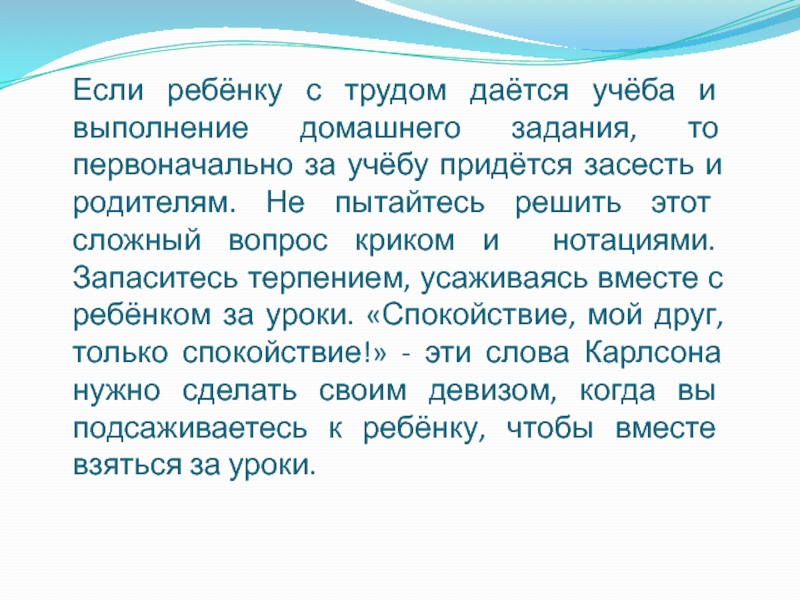 Слайд 9Если ребёнку с трудом даётся учёба и выполнение домашнего задания, то