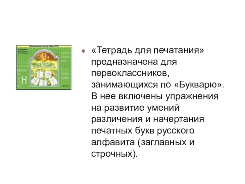 «Тетрадь для печатания» предназначена для первоклассников, занимающихся по «Букварю». В