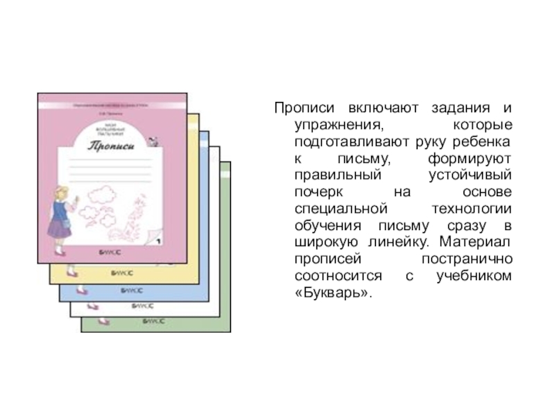 письму, формируют правильный устойчивый почерк на основе специальной технологии обучения письму сразу в широкую линейку. Материал прописей постранично соотносится с учебником «Букварь».