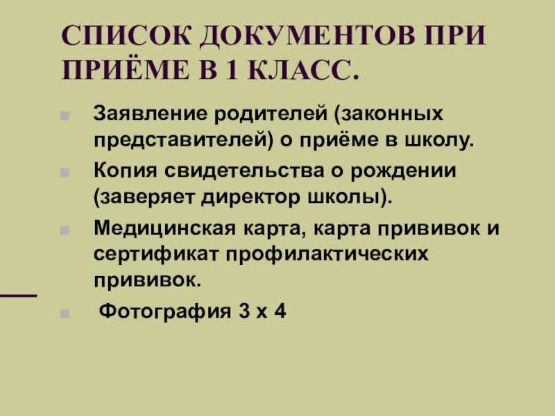 Слайд 21СПИСОК ДОКУМЕНТОВ ПРИ ПРИЁМЕ В 1 КЛАСС.