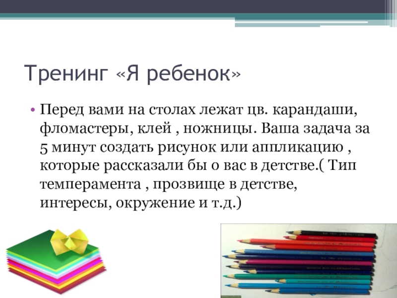 Тренинг «Я ребенок»Перед вами на столах лежат цв. карандаши, фломастеры, клей , ножницы. Ваша задача за 5