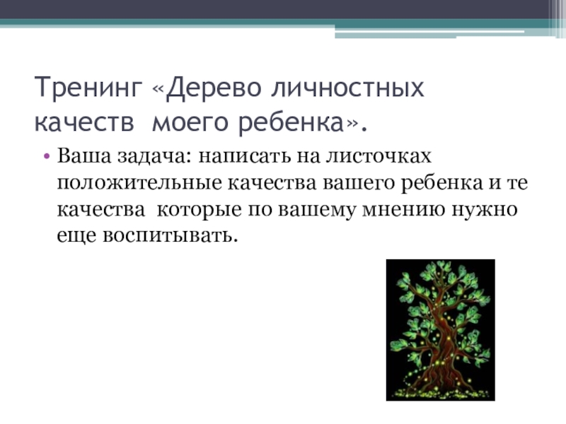 Слайд 4Тренинг «Дерево личностных качеств моего ребенка».