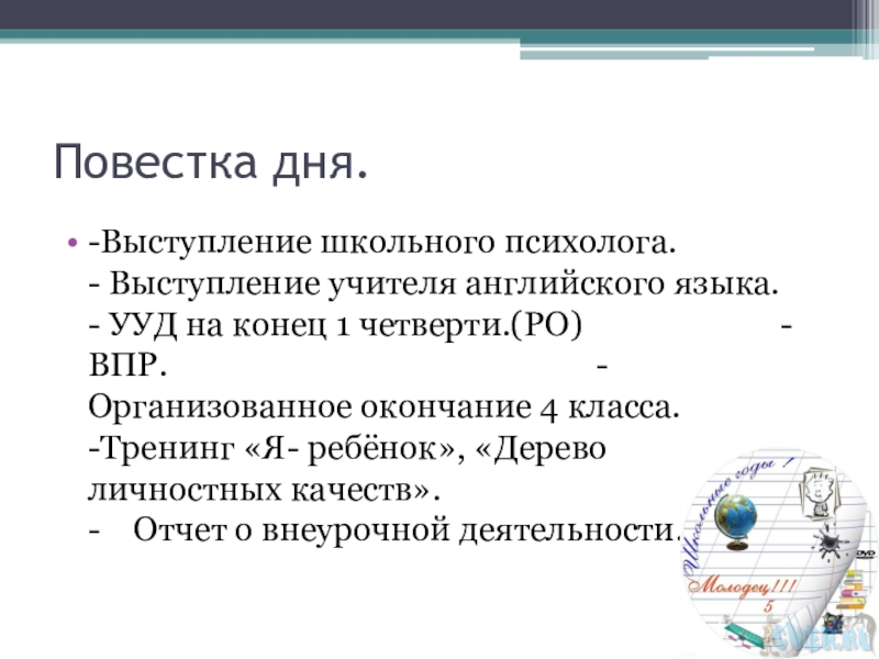 Повестка дня.-Выступление школьного психолога. - Выступление учителя английского языка. - УУД на конец 1 четверти.(РО)