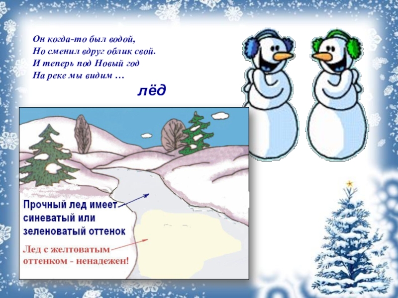 Он когда-то был водой,Но сменил вдруг облик свой.И теперь под Новый годНа реке мы видим …лёд