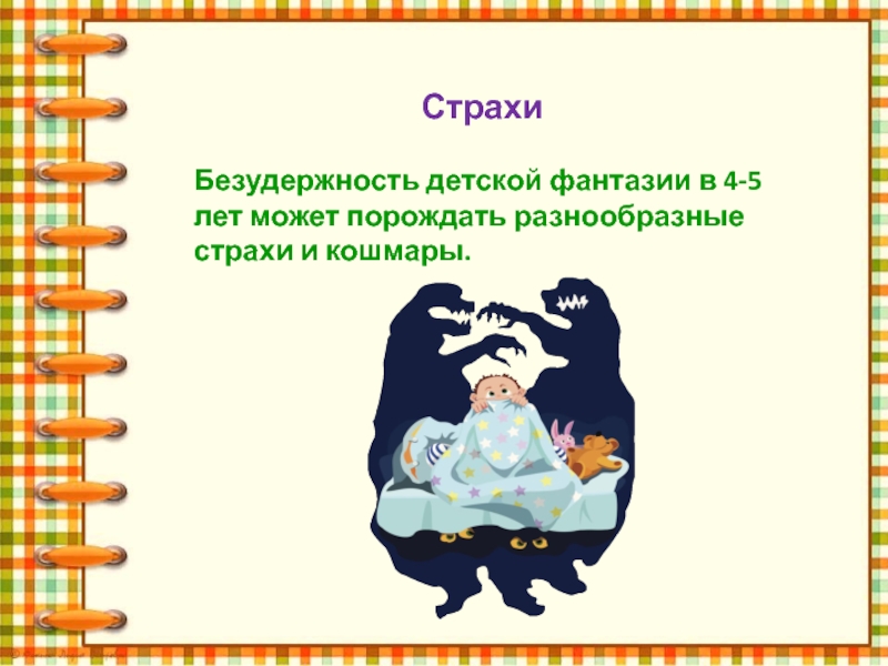 Слайд 28Ребёнку 4-5 лет не нужно рассказывать страшные истории, показывать ужастики, рассуждать