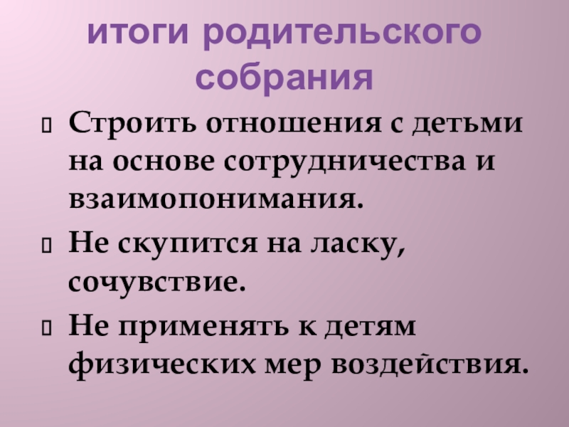 итоги родительского собранияСтроить отношения с детьми на основе сотрудничества и взаимопонимания.Не скупится на ласку, сочувствие.Не применять к