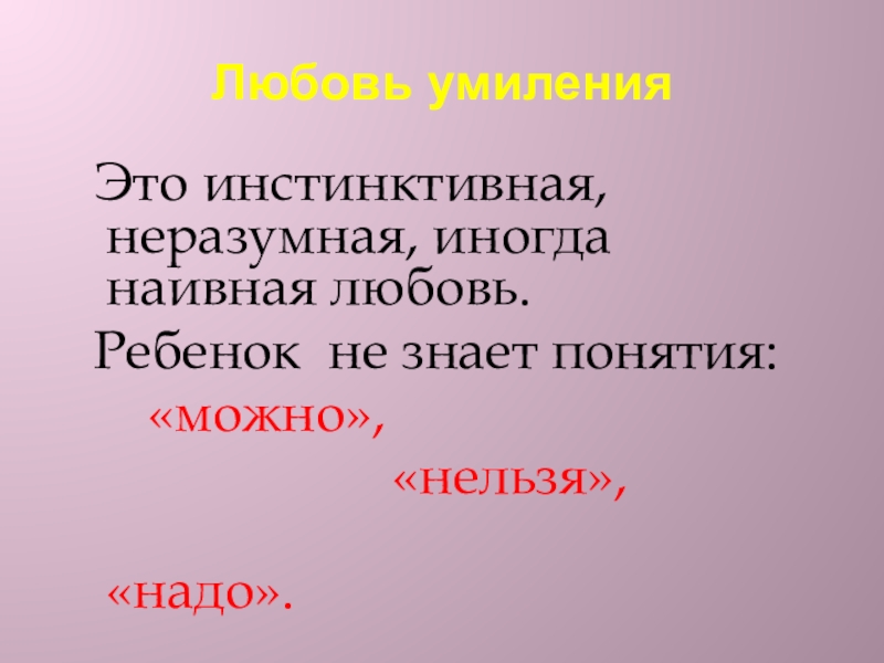 Любовь умиления  Это инстинктивная, неразумная, иногда наивная любовь. Ребенок не знает понятия:    «можно»,