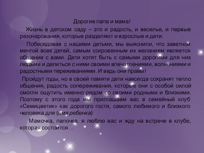 Пройдут годы, но в своей памяти дети навсегда сохранят тепло общения, радость сопереживания, которые они с особой силой смогли ощутить именно рядом со своими родными и близкими. Поэтому с этого года мы приглашаем вас в семейный клуб «Семицветик» как дорогого гостя, самого любимого и близкого человека для (имя ребенка)