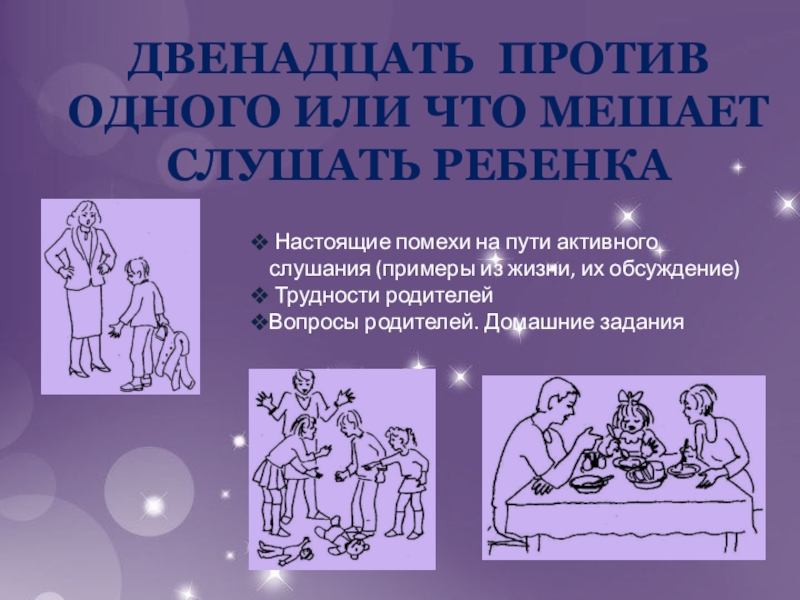 Слайд 12ДВЕНАДЦАТЬ ПРОТИВ ОДНОГО ИЛИ ЧТО МЕШАЕТ СЛУШАТЬ РЕБЕНКА