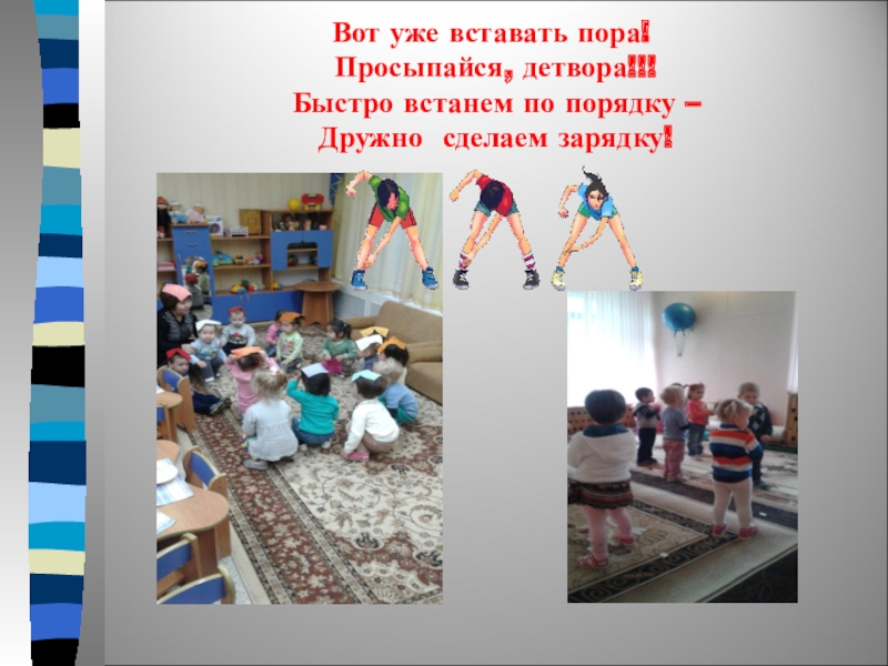 Слайд 5Вот уже вставать пора! Просыпайся, детвора!!! Быстро встанем по порядку –