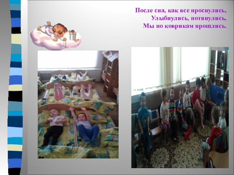 Слайд 15После сна, как все проснулись, Улыбнулись, потянулись, Мы по коврикам прошлись.