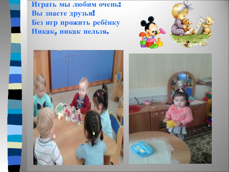 Играть мы любим очень: Вы знаете друзья! Без игр прожить ребёнку Никак, никак нельзя.