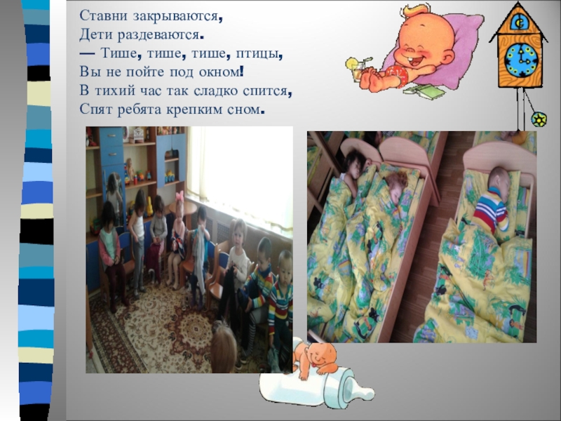 Ставни закрываются, Дети раздеваются. — Тише, тише, тише, птицы, Вы не пойте под окном! В тихий час