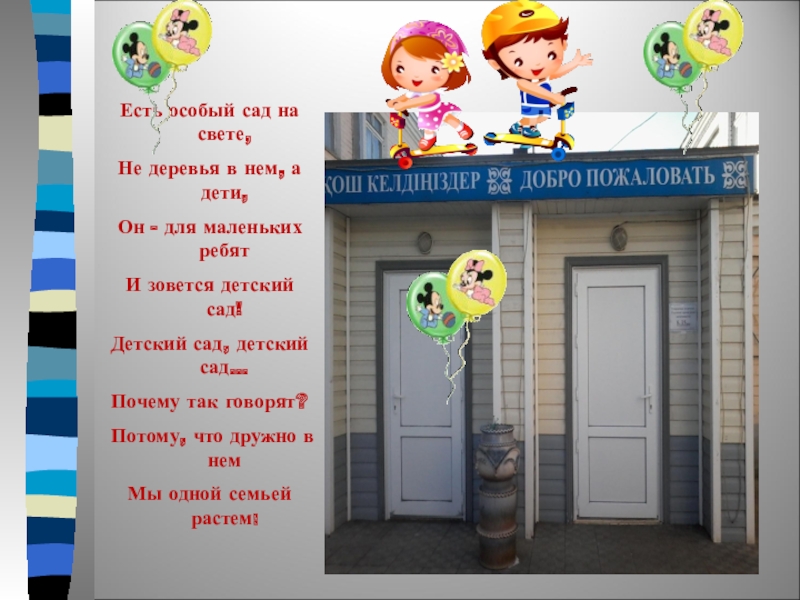 Есть особый сад на свете,Не деревья в нем, а дети,Он - для маленьких ребят И зовется детский сад!Детский сад, детский сад…Почему так говорят?Потому, что дружно в немМы одной семьей растем!