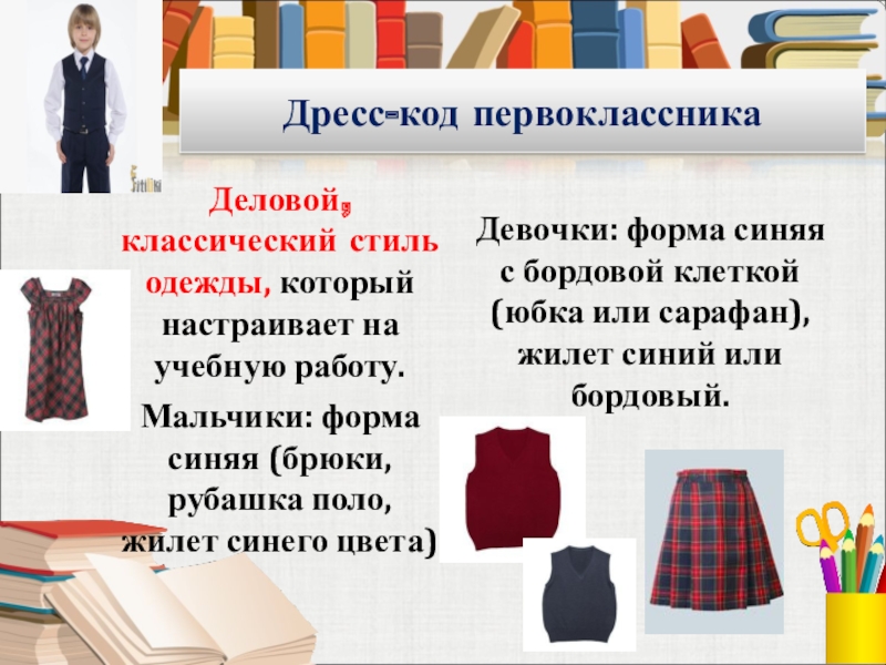 Девочки: форма синяя с бордовой клеткой (юбка или сарафан), жилет синий или бордовый.