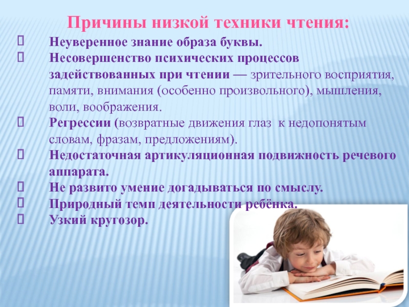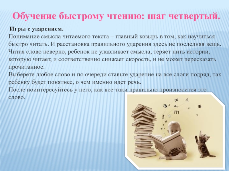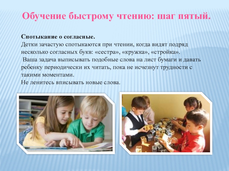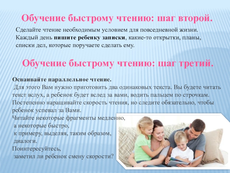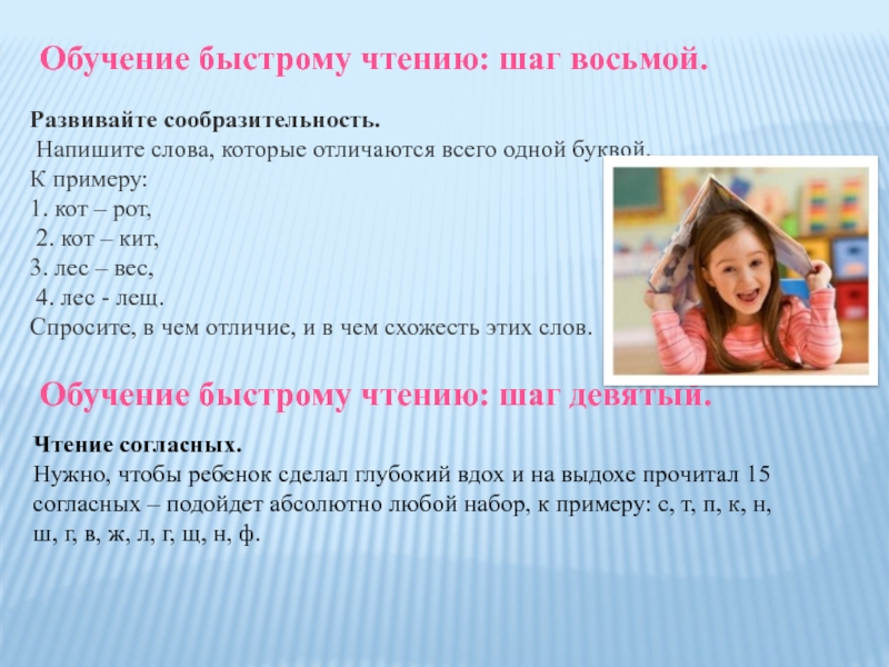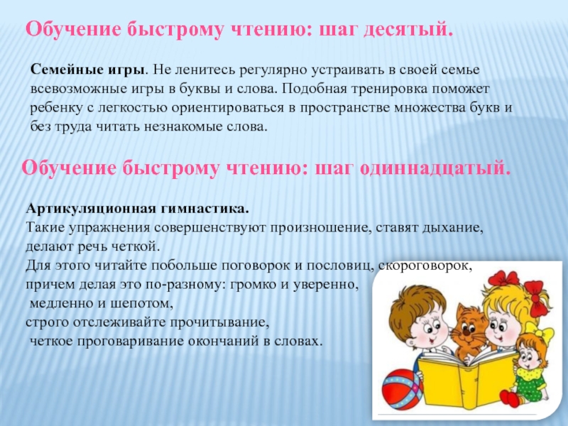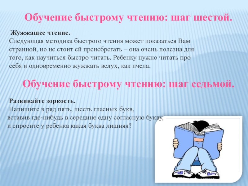 Ребенок, молча, читает с максимальной скоростью небольшой абзац, следующий абзац он должен начать читать вслух, потом снова – абзац про себя. (чтение про себя, гораздо быстрее, чтения вслух, при резких переходах темп чтения частично сохраняется, и ребенок читает быстрее).