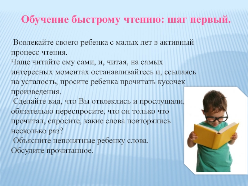Для этого Вам нужно приготовить два одинаковых текста. Вы будете читать текст вслух, а ребенок будет вслед за вами, водить пальцем по строчкам. Постепенно наращивайте скорость чтения, но следите обязательно, чтобы ребенок успевал за Вами.