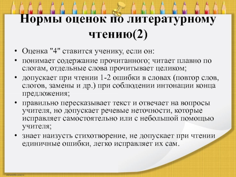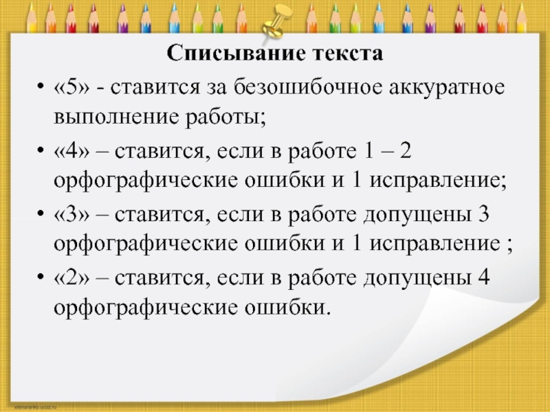 «4» - ставится, если допущено не более двух орфографических и двух пунктуационных ошибок или одной орфографической и трёх пунктуационных ошибок; работа выполнена чисто, но есть небольшие отклонения от каллиграфических норм.