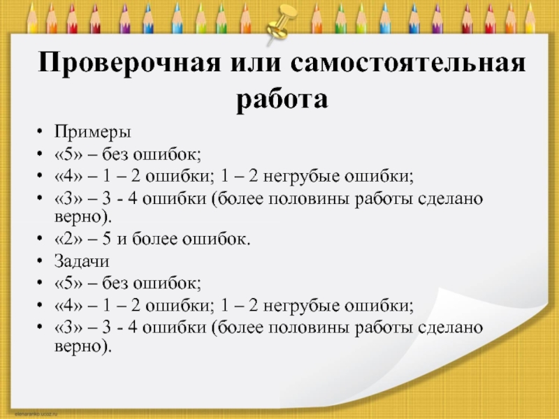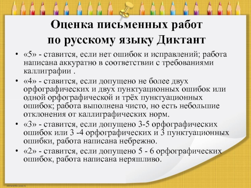 «3» - ставится, если допущено 3-5 орфографических ошибок или 3 -4 орфографических и 3 пунктуационных ошибки, работа написана небрежно.