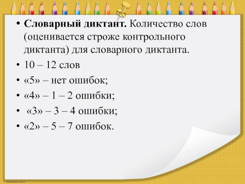 Слайд 4Словарный диктант. Количество слов (оценивается строже контрольного диктанта) для словарного диктанта.