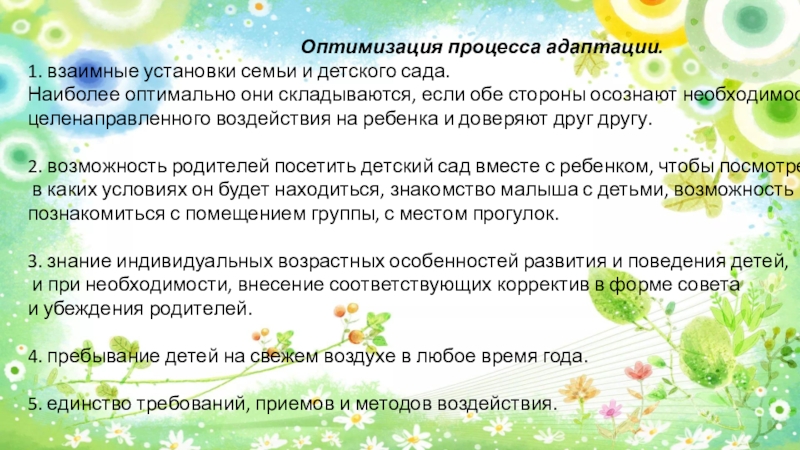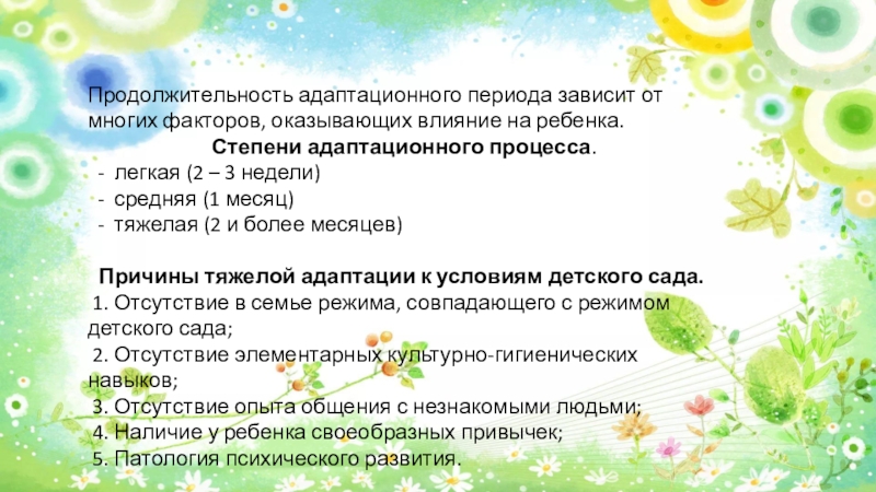 Слайд 3Продолжительность адаптационного периода зависит от многих факторов, оказывающих влияние на ребенка.
