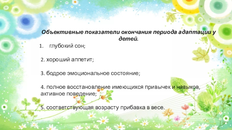 Слайд 5Объективные показатели окончания периода адаптации у детей.