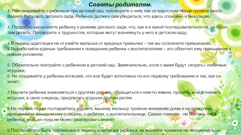 9.Постарайтесь быть терпимыми в период адаптации ребенка, не жалейте времени на эмоционально-личностное общение с ребенком, поощряйте посещение детского сада ребенком.