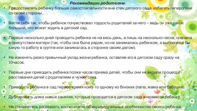 Первые несколько дней проводить ребенка не на весь день, а лишь на несколько часов, сначала в присутствии матери (так, чтобы она была рядом, но не занималась ребенком, а выполняла бы какую-то работу в группе или занималась в сторонке своим делом).
