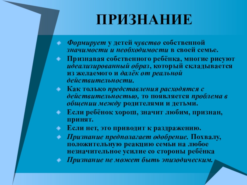 Признание предполагает одобрение. Похвалу, положительную реакцию семьи на любое незначительное усилие со стороны ребёнка