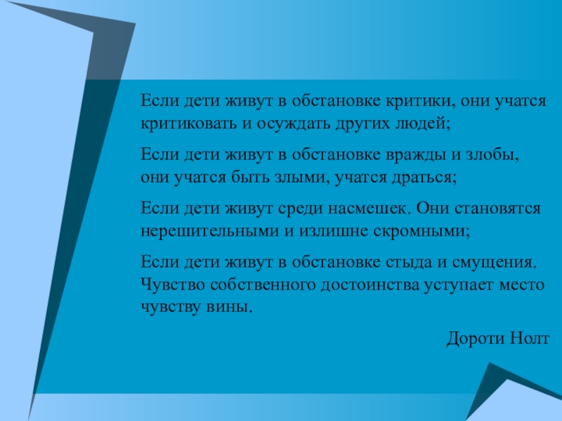 Слайд 2Если дети живут в обстановке критики, они учатся критиковать и осуждать