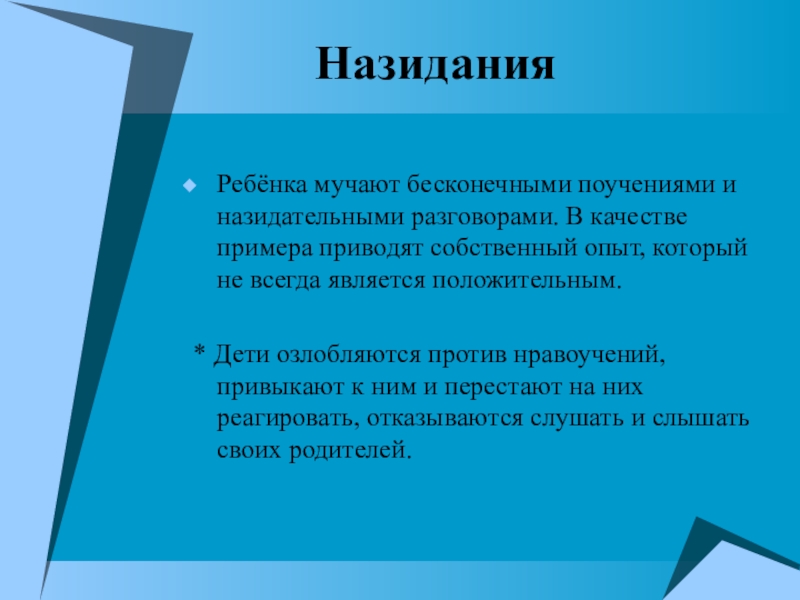 * Дети озлобляются против нравоучений, привыкают к ним и перестают на них реагировать, отказываются слушать и слышать своих родителей.