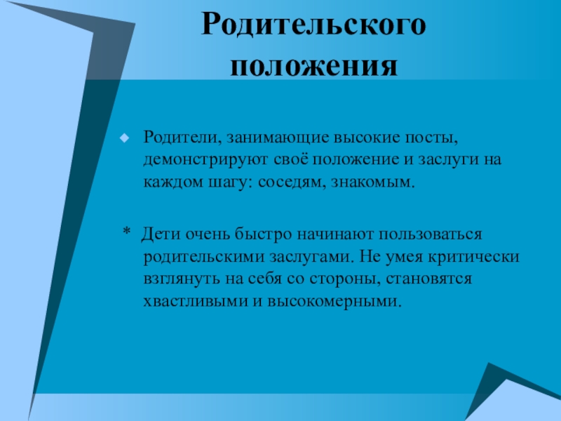 * Дети очень быстро начинают пользоваться родительскими заслугами. Не умея критически взглянуть на себя со стороны, становятся хвастливыми и высокомерными.