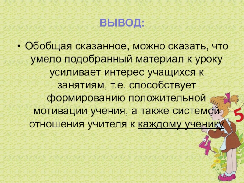 Обобщая сказанное, можно сказать, что умело подобранный материал к уроку усиливает