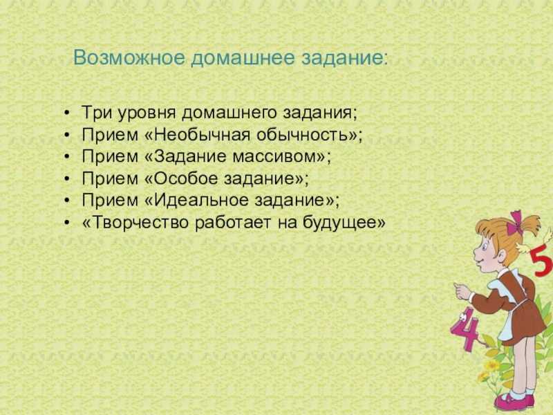 6) стимулирование деятельности, через оценку (благодарность, словесное поощрение, выставку лучших работ), оказание учителем незначительной помощи, усложнение заданий.