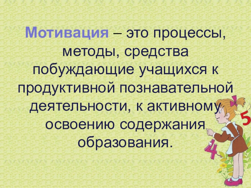 Слайд 2Мотивация – это процессы, методы, средства побуждающие учащихся к продуктивной познавательной