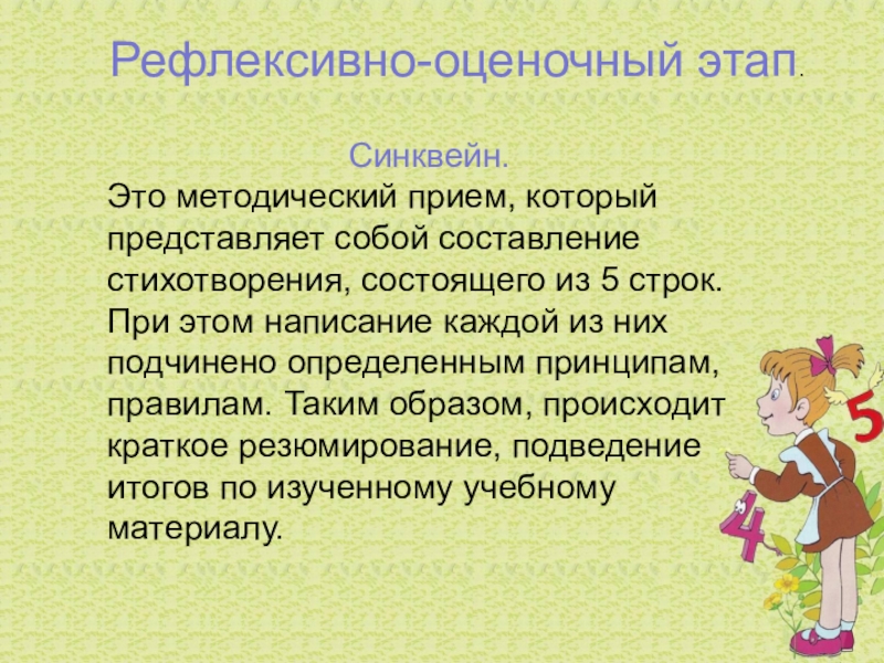 5 строк. При этом написание каждой из них подчинено определенным принципам, правилам. Таким образом, происходит краткое резюмирование, подведение итогов по изученному учебному материалу.