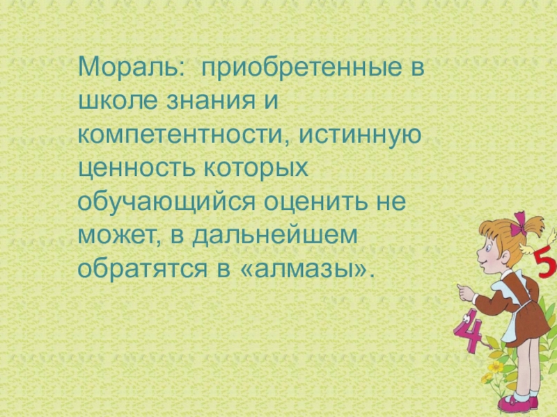 Слайд 22Мораль: приобретенные в школе знания и компетентности, истинную ценность которых обучающийся