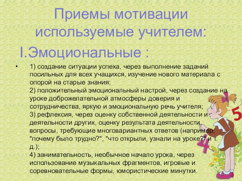 2) положительный эмоциональный настрой, через создание на уроке доброжелательной атмосферы доверия и сотрудничества, яркую и эмоциональную речь учителя;