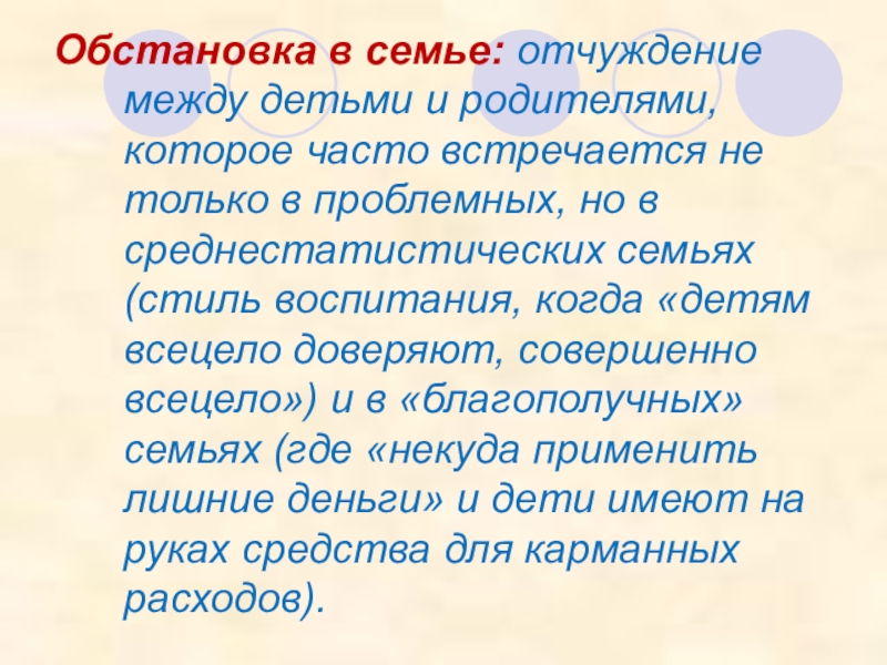Слайд 13Обстановка в семье: отчуждение между детьми и родителями, которое часто встречается