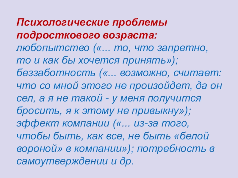 как бы хочется принять»); беззаботность («... возможно, считает: что со мной этого не произойдет, да он сел, а я не такой - у меня получится бросить, я к этому не привыкну»); эффект компании («... из-за того, чтобы быть, как все, не быть «белой вороной» в компании»); потребность в самоутверждении и др.