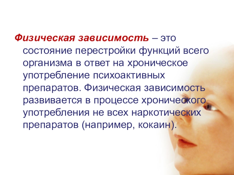 ответ на хроническое употребление психоактивных препаратов. Физическая зависимость развивается в процессе хронического употребления не всех наркотических препаратов (например, кокаин).