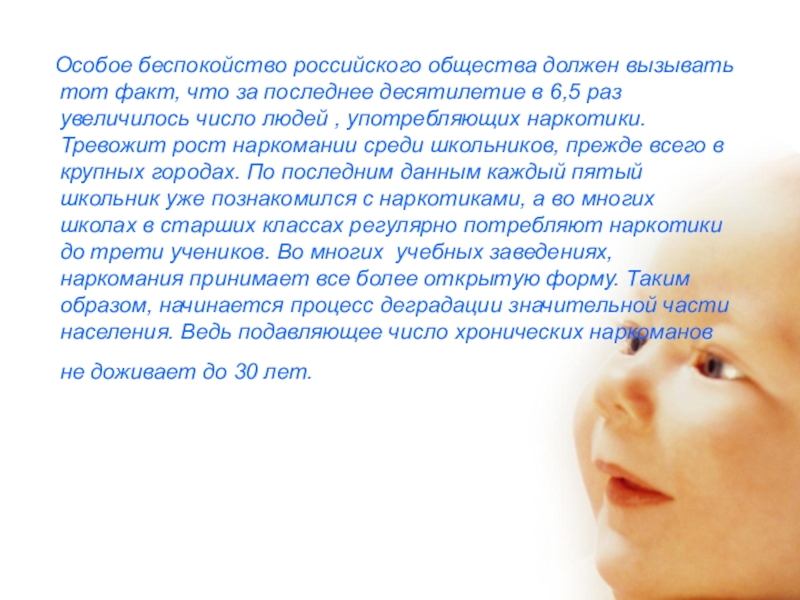 за последнее десятилетие в 6,5 раз увеличилось число людей , употребляющих наркотики. Тревожит рост наркомании среди школьников, прежде всего в крупных городах. По последним данным каждый пятый школьник уже познакомился с наркотиками, а во многих школах в старших классах регулярно потребляют наркотики до трети учеников. Во многих учебных заведениях, наркомания принимает все более открытую форму. Таким образом, начинается процесс деградации значительной части населения. Ведь подавляющее число хронических наркоманов не доживает до 30 лет.