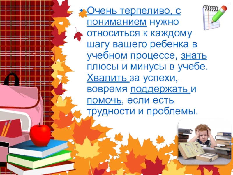 в учебном процессе, знать плюсы и минусы в учебе. Хвалить за успехи, вовремя поддержать и помочь, если есть трудности и проблемы.