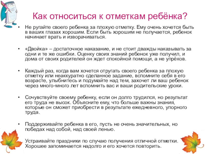 «Двойка» – достаточное наказание, и не стоит дважды наказывать за одни и те же ошибки. Оценку своих знаний ребенок уже получил, и дома от своих родителей он ждет спокойной помощи, а не упрёков.