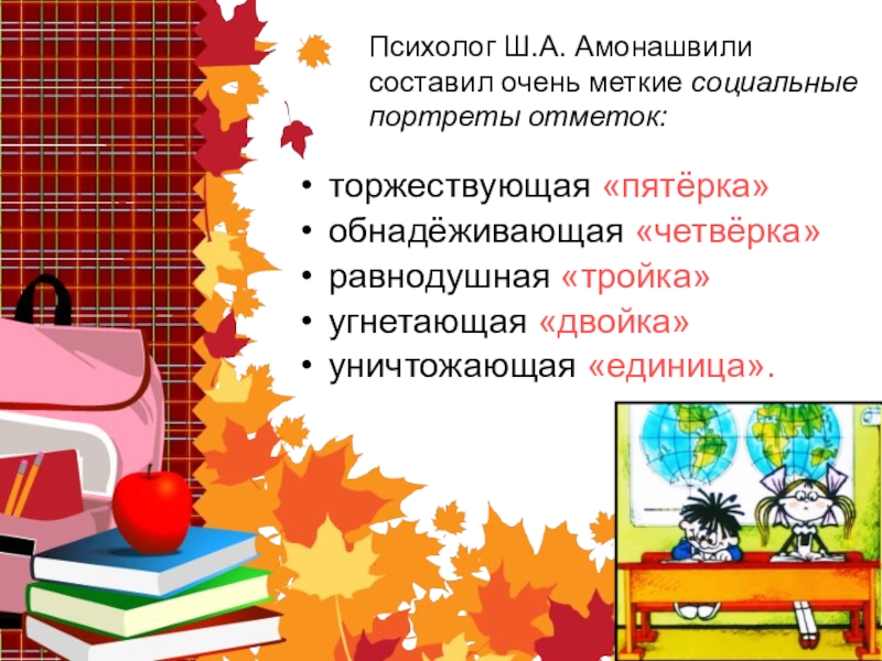 Слайд 10Психолог Ш.А. Амонашвили составил очень меткие социальные портреты отметок: