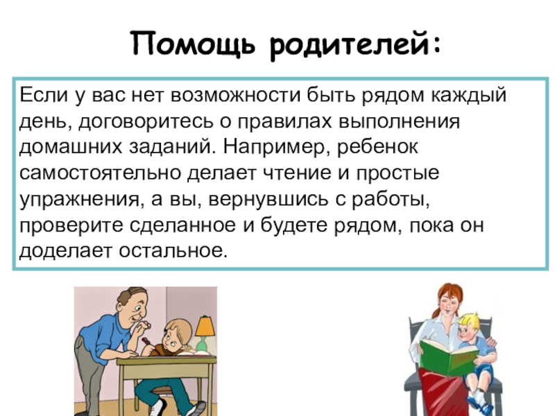 о правилах выполнения домашних заданий. Например, ребенок самостоятельно делает чтение и простые упражнения, а вы, вернувшись с работы, проверите сделанное и будете рядом, пока он доделает остальное.