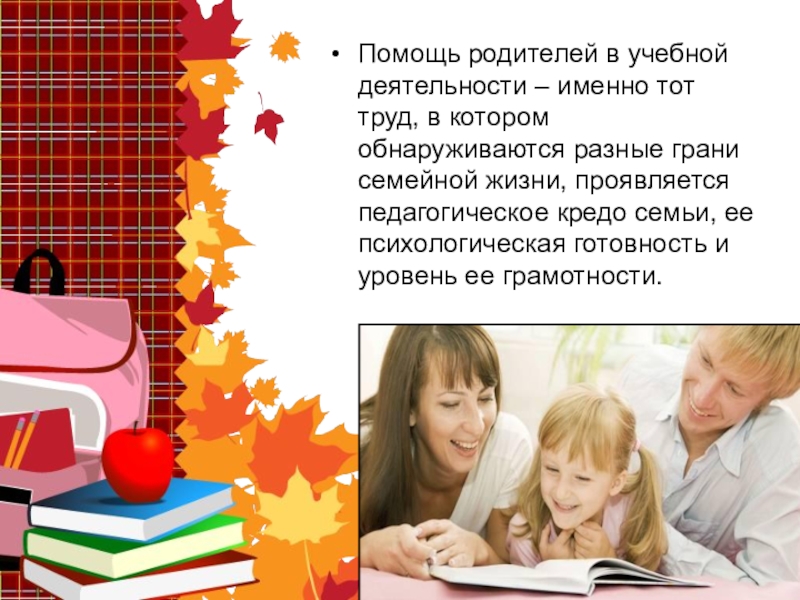 Слайд 3Помощь родителей в учебной деятельности – именно тот труд, в котором