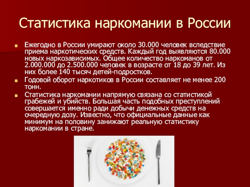 вследствие приема наркотических средств. Каждый год выявляются 80.000 новых наркозависимых. Общее количество наркоманов от 2.000.000 до 2.500.000 человек в возрасте от 18 до 39 лет. Из них более 140 тысяч детей-подростков.