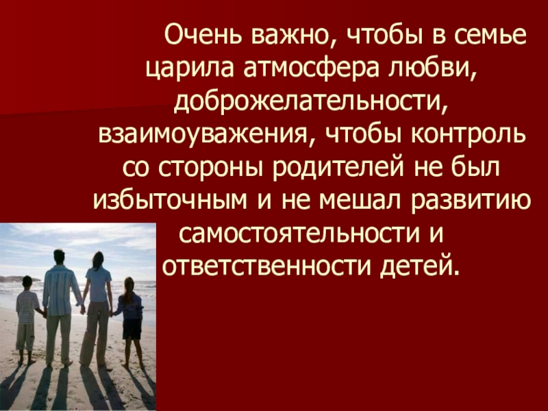 любви, доброжелательности, взаимоуважения, чтобы контроль со стороны родителей не был избыточным и не мешал развитию самостоятельности и ответственности детей.