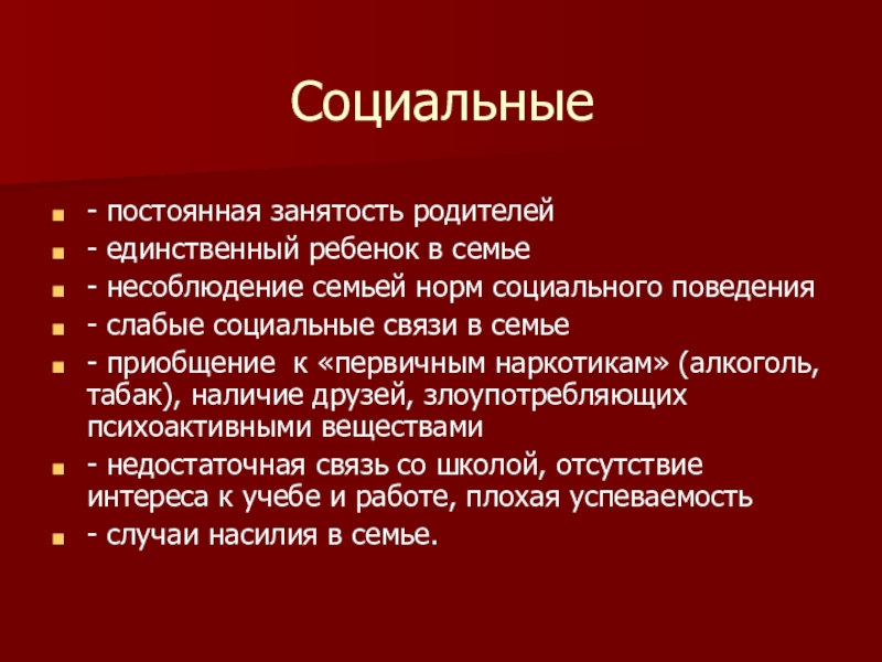 - приобщение к «первичным наркотикам» (алкоголь, табак), наличие друзей, злоупотребляющих психоактивными веществами